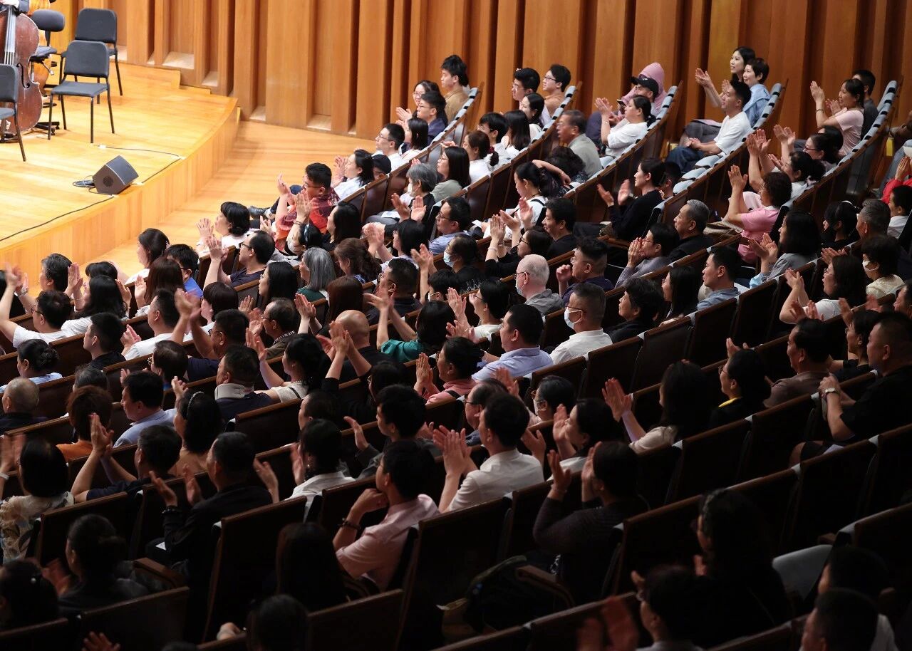 當《拉巴姆巴》的旋律響起時,指揮帶領觀眾鼓掌打節(jié)拍,臺上臺下互動默契,現(xiàn)場瞬間變成一片歡樂的海洋;《白蘭鴿》的靈動旋律,則讓人仿佛置身于自由遼闊的天地間。音樂會最后一曲,蕩氣回腸的《天路》旋律響起,指揮家彭家鵬在指揮樂團的同時也隨時面向觀眾帶動氣氛,熟悉的旋律引發(fā)全場大合唱,激情澎湃的歌聲與恢弘的交響樂交織,將現(xiàn)場氣氛推向高潮。熱烈洋溢的掌聲與喝彩聲就是對藝術家最好的致敬和褒獎,掌聲持續(xù)了長達數(shù)分鐘之久。指揮與樂團多次謝幕,并帶來兩首返場曲目讓人們大呼過癮。最后返場曲目《再見》奏響時,全場觀眾點亮手機電筒,國家大劇院內(nèi)瞬間化作 “星光閃爍” 的浪漫星空,樂團聲部演奏家們在演奏中默契地分批次走下舞臺,并向觀眾揮手致意告別。當指揮家彭家鵬與首席田雪合作將樂曲最后一個音符演奏完畢時,全場觀眾再次爆發(fā)出潮水般的掌聲和經(jīng)久不息的歡呼聲,為音樂會畫上圓滿的句號。