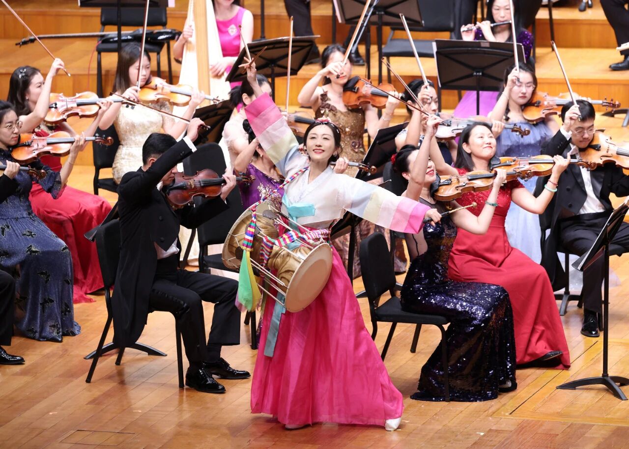 打擊樂演奏家戚潔與指揮及樂團攜手合作,精彩演繹了長鼓與樂隊《紅太陽照邊疆》。她那清亮優(yōu)美的鼓聲,翩然起舞的擊鼓姿態(tài),以及色彩艷麗的傳統(tǒng)民族服飾,不僅喚醒了幾代人心中深植的歲月記憶,更讓全場觀眾合著節(jié)拍,在心中跟隨演奏的旋律一同輕聲吟唱。