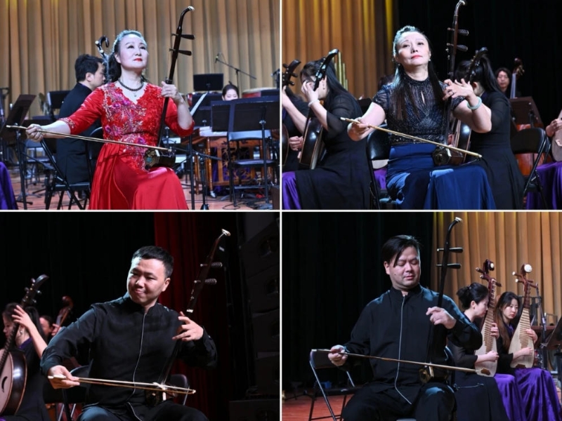 隨后,《春華秋實(shí)》以明快節(jié)奏贊頌和平生活;《北風(fēng)吹》《紅頭繩》(《白毛女》選段)奏出“反抗壓迫”的主題內(nèi)核。二胡與樂(lè)隊(duì)《陜北民歌聯(lián)奏》質(zhì)樸的樂(lè)聲傳遞出陜北人民的樂(lè)觀精神,二胡演奏家楊柳、殷焱、楊一、萬(wàn)億,默契合作、技藝精湛、演繹動(dòng)人;《地道戰(zhàn)》生動(dòng)還原了冀中軍民智勇抗敵的場(chǎng)景。