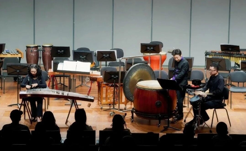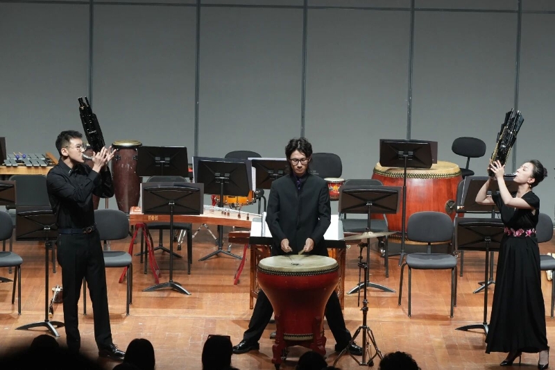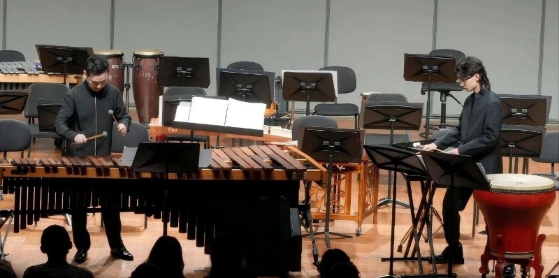 打擊樂(lè)重奏《京劇印象》第一樂(lè)章讓人耳目一新。美國(guó)作曲家 Gene Koshinski 以京劇元素為靈感,董淼、王兆翔兩位青年打擊樂(lè)演奏家用馬林巴、大鼓等樂(lè)器,傳神演繹京劇的 “唱念做打”,讓國(guó)粹京劇在民族打擊樂(lè)的創(chuàng)新演奏中煥發(fā)新的活力。