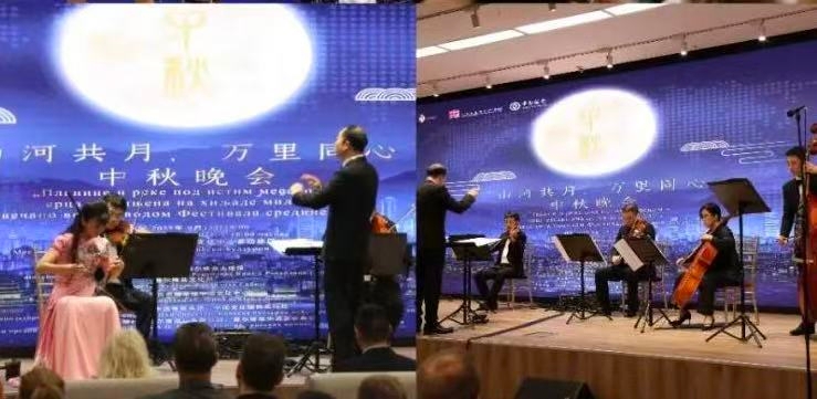 9月15日,藝術家們參演了由中國駐塞爾維亞使館指導,貝爾格萊德中國文化中心主辦的“天涯共此時”中秋系列活動的首場活動----“山河共月 萬里同心”中秋晚會。樂團在指揮張冰冰帶領下為觀眾們獻上了《良宵》《二泉映月》《花好月圓》等中國經典名曲和三首巴爾干經典曲目,著名胡琴演奏家姜克美傾情演繹的《賽馬》《夜深沉》驚艷了全場。藝術家們的精彩演出營造出濃濃的節日氛圍。晚會最后,藝術家們還與塞爾維亞愛樂樂團的藝術家共同演奏《我的祖國》,用音樂生動詮釋了兩國人民“山河共月,萬里同心”的深厚情誼,將整場晚會的氣氛推向最高潮。